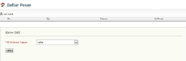 Menu ini digunakan sebagai proses pelaporan data terupdate menggunakan media SMS. Modul ini akan dikembangkan menjadi sms schedule, sehingga dapat di set/konfigurasi setiap kapan dan nomor siapa saja yang akan dikirim. Saat ini no uji coba menggunakan no operator biasa, yang nantinya bisa dikembangkan no pengirim menggunkan Alias.