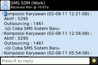 Format sms saat ini adalah : Komposisi Karyawan[waktu Saat Ini] [Aktif] dan [OS] yang didapatkan dari database saat ini. Hasil pengiriman sms, sebagai berikut :