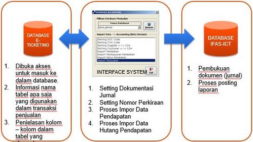 Modul Interface e-Ticketing adalah modul yang menjembatani aplikasi e-Ticketing dengan Integrate Financial Accounting Sistem sehingga proses pendataan front end yang ada pada aplikasi e-Ticketing dapat langsung terintegrasi dengan database Integrate Financial Accounting