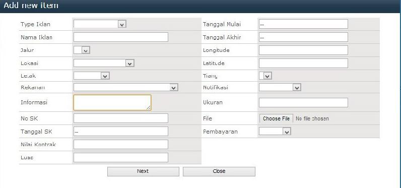 - Input Reklame, Form yang berfungsi untuk menginput data latitude dan longitude peta lokasi dan informasi pendukung dan upload .